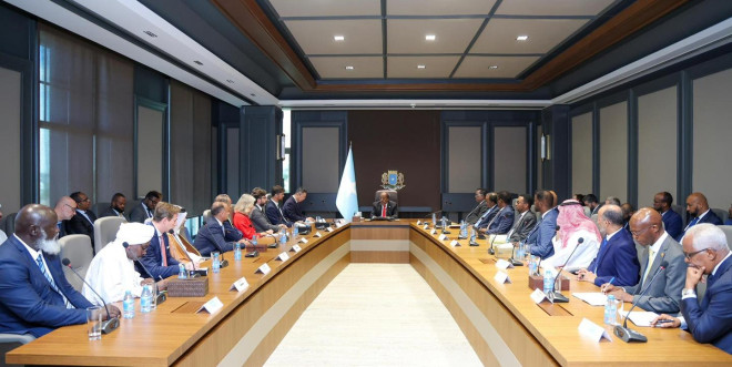 Madaxweyne Xasan Sheekh Maxamuud ayaa Aqalka Madaxtooyada ee Muqdisho ku qaabilay danjireyaasha iyo wakiillada hay’adaha caalamiga ah ee ka howlgala dalka, isaga oo la wadaagay warbixin ku saabsan xaaladda guud ee Soomaaliya.