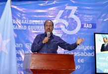 Madaxweynaha Jamhuuriyadda Federaalka Soomaaliya Mudane Xasan Sheekh Maxamuud oo khudbad ka jeediyey Munaasabadda xuska sannad-guurada 63-aad ee markii calan Soomaaliyeed oo xor ah laga...